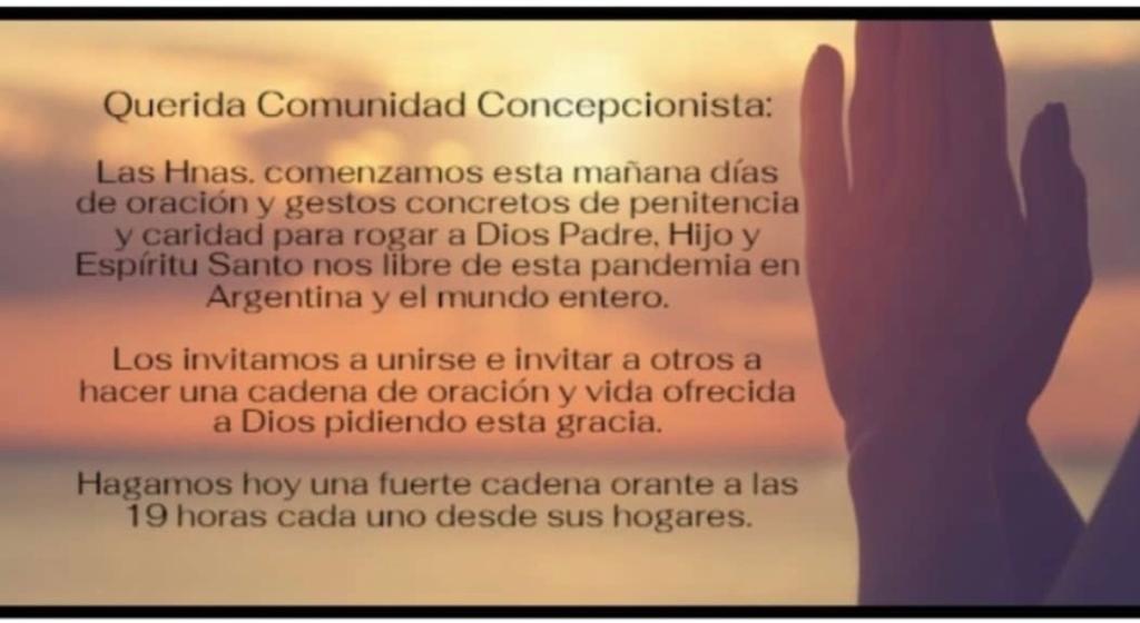 La invitación es que a las 19 hs del día viernes 28 de mayo desde nuestros hogares nos sumemos a la cadena de oración de la familia Concepcionista.